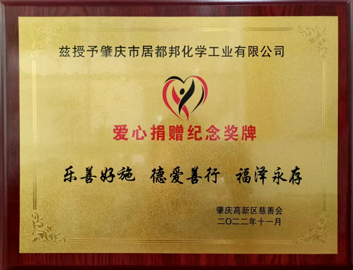 11月16日,“奉獻愛心力量,彰顯企業擔當”,肇慶市高新區愛心慈善會,為肇慶市居都邦化學工業有限公司授予《愛心捐贈紀念獎...